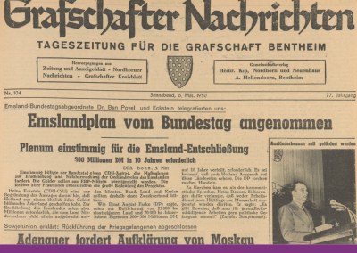 Über die Verabschiedung des Emslandplans am 05.05.1950 wurde auch in der Grafschaft Bentheim groß berichtet. Im Februar 1951 kam der Direktor der Emsland GmbH, J. D. Lauenstein, nach Nordhorn. Mit der Kreisverwaltung besprach man den Zehnjahresplan für die Grafschaft. Die Bürgermeister der Niedergrafschafter Gebiete stellten in einer Denkschrift ihre Sorgen und Nöte dar – der Emslandplan sollte hier Abhilfe schaffen. Schlechte bis keine Straßen, fehlende Entwässerung, eine Ödlandfläche von mehr als 15% der Kreisfläche – das waren die Probleme der Zeit. Der Emslandplan erschien vielen Grafschaftern wie ein Heilsbringer, der endlich andere Verhältnisse schaffen sollte.