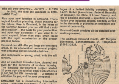 Weitblick hatte die Emsland GmbH bewiesen mit ihrer englischsprachigen Werbeanzeige zum Emslandplan. Diese war 1970 in der Financial Times und wenig später auch in skandinavischen Zeitungen erschienen. Angeblich habe es nach drei Tagen bereits Anfragen britischer Unternehmen gegeben. Ein Hotelier aus Brüssel habe daraufhin sogar angeboten, ein neues Hotel im Emsland zu eröffnen, da eine Vielzahl an Industrieunternehmen auch viele Übernachtungen nach sich zöge. Ob die Anzeige letztlich nachhaltigen Erfolg hatte, ist unklar. Sie war später im Emsland in einem Pressebericht wieder abgedruckt worden. Dort urteilte der Reporter, dass „nach dem heutigen Stand [=1970] der Dinge [die internationale Ansiedlung] noch eine Zukunftsvision“ sei. Eindrücklich zeigt die Anzeige das Selbstverständnis der Emsland GmbH: International, offen für neue Wege und eine ausgezeichnete Kommunikation.