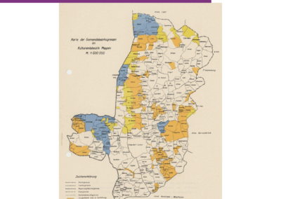 Wesentlich waren im Emslandplan die Flurbereinigungen. Diese fanden nahezu in allen Gebieten des Emslanderschließungsgebietes statt. Diese undatierte Karte des Kulturamtes in Meppen aus dem Archiv des Emsländischen Heimatbundes zeigt, wie großflächig die Vorhaben waren. Verantwortlich war dafür das Kulturamt in Meppen, das für die Neuorganisation der Landwirtschaft sorgte und zwischen 1950 und 1960 600 neue Bauernhöfe schuf. Die Flurbereinigungen machten vor allem ab den 1960er-Jahren die Landwirtschaft effizienter, Bauern mussten nun nicht mehr weite Wege in Kauf nehmen, um ihre kleinflächigen Parzellen zu bewirtschaften. Die Flurbereinigungsverfahren führten allerdings auch dazu, dass Tierarten verdrängt wurden, da nun großflächigerer Landbau betrieben wurden. Ältere Höfe wurden zudem ausgesiedelt. Die Emsland GmbH hat die Flurbereinigungen zum Teil organisiert, um den Raum zu ordnen. Ihr zweiter Geschäftsführer Georg Sperl (Foto) bezeichnete sich selbst bei seinem 40-jährigen Jubiläum im Öffentlichen Dienst am 29. Juli 1970 als „Schmiermaxe der Flurbereinigung“. Im Rahmen des Emslandplan-Jubiläums zeigt der Heimatverein Langen noch bis kommendes Jahr eine Fotoausstellung zur Flurbereinigung in Langen und den Folgen für das Dorf und die Landwirtschaft.