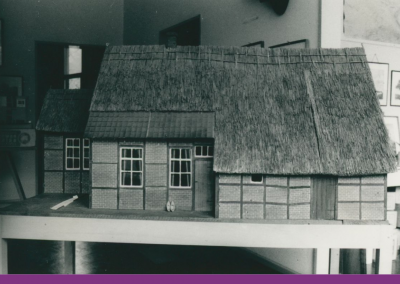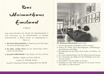 Im Zuge der Emslanderschließung war die Frage nach der „Heimat“ und dem Verlust von seit Jahrhunderten bestehenden Strukturen häufiges Thema. In Meppen hatte sich daher 1952 der Emsländische Heimatverein (ab 1967: Heimatbund) gegründet. Dieser stand in engem Austausch mit der Emsland GmbH. Kern der Tätigkeit war die Heimatpflege. Dafür war Dr. Elisabeth Schlicht (siehe Beitrag 10) als erste Geschäftsführerin angestellt worden. Sie hatte sich intensiv mit dem historischen Erbe des Emslandes beschäftigt und war Ideengeberin für die Einrichtung eines „Heimathauses“. Dies war erstmalig 1954 in der ehemaligen Landwirtschaftsschule in Meppen eingerichtet worden. 1958 wurde schließlich im Meppener Gymnasium das Heimathaus Emsland (neu) eröffnet, dessen Aufgabe darin bestand, eine „Heimstätte“ für die Heimatpflege zu sein. Hier befand sich eine Heimatbücherei, ein Archiv mit Urkunden, eine Bildersammlung sowie Berichte über Naturschutz und Landschaftspflege. Darüber hinaus wurde hier auch ein Museum eingerichtet, das die Emsländische Geschichte darstellte. Unterteilt war dies in die Abschnitte Moorlandschaft, Geestlandschaft und Flusslandschaft. Damit waren die drei wichtigsten landschaftlichen Kategorien des Emslandes abgedeckt. Das Museum stellte das alte Emsland sowie den Umbruch mit den Kultivierungsarbeiten dar. Gerade in einer Zeit, als im Emsland vieles neu entstand, traf das Heimathaus einen Nerv. Bis 1960 wurden 8.000 Besucher gezählt. Die Ausstellung zeigte das neue Gesicht der Landschaft, den Wandel in der Landwirtschaft anhand von Hausmodellen, aber auch den technologischen Fortschritt. Die in den Folgejahren organisierten Sonderausstellungen thematisierten immer wieder die Eigenheiten des Emslandes, zum Beispiel in Form von Geschichts- und Kunstausstellungen. Aufgrund von Platzmangel des Gymnasiums war dem Heimathaus allerdings nur eine kurze Lebensdauer beschert: Bereits 1963 musste das Museum den Anforderungen der Schule weichen.
