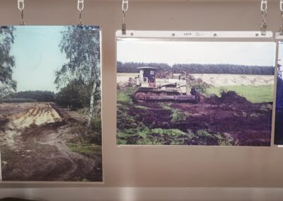 Im Heimathaus Langen gibt es nun ein Jahr lang eine Ausstellung zu sehen, die das Thema der Flurbereinigung in den 1950er- und 1960er-Jahren für den Ort aufgreift. Anhand von ausgewählten Fotografien werden die Maßnahmen der Flurbereinigung sowie die Auswirkungen auf die Landwirtschaft und das Ortsbild dargestellt. Die Flurbereinigung hat nicht nur dazu geführt, dass Ackerflächen zusammengelegt wurden. Vielmehr sind etliche alte Höfe und Heuerlingshäuser aus dem Ortsbild verschwunden. Von rund 120 Häusern sollen rund 80 abgerissen worden sein. Dies hängt auch damit zusammen, dass immer weniger Menschen in der Landwirtschaft ihr Auskommen fanden und stattdessen in Lingen bei der Raffinerie oder bei den Nordhorner Textilbetrieben arbeiteten. Neue Siedlungen entstanden, in denen die Menschen dann lebten. Neben der Flurbereinigung zeigen die Bilder auch, wie die Nutzflächen entwässert wurden. Problem war, dass das Wasser nicht abgeleitet werden konnte. Drainagen und Entwässerungsgräben waren fortan notwendig.
