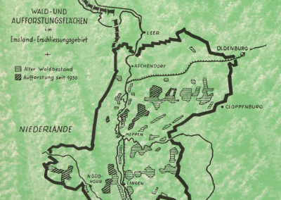 Auch die Waldentwicklung war ein wichtiges Ziel des Emslandplans. Die Aufforstung, also Anpflanzung von Bäumen, diente dabei vor allem dem Windschutz. Wälder sollten die neu gewonnenen Ackerflächen gegen Verwehungen sichern. Insgesamt wurden im Erschließungsgebiet des Emslandplans etwa 18.000 ha Fläche aufgeforstet. Dabei spielten die Waldschutzgenossenschaften als Träger eine wichtige Rolle. Sie mussten oft neu gegründet werden, was bei den Landwirten zum Teil für Missmut sorgte. In der Grafschaft Bentheim gab es jedoch schon seit 1937 zwei aktive Waldschutzgenossenschaften in Wilsum und Itterbeck – hier hatte man bereits früh weitsichtig agiert.