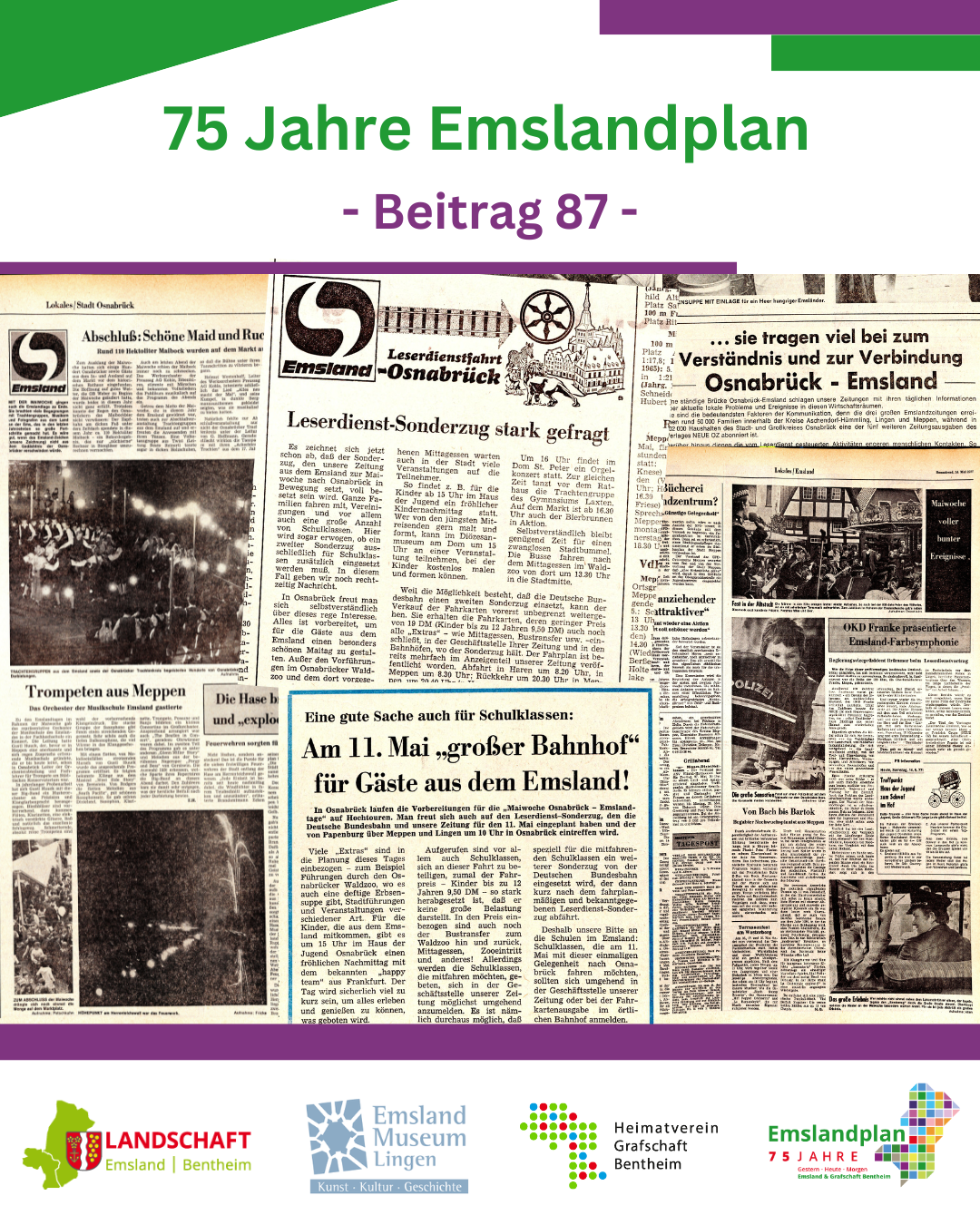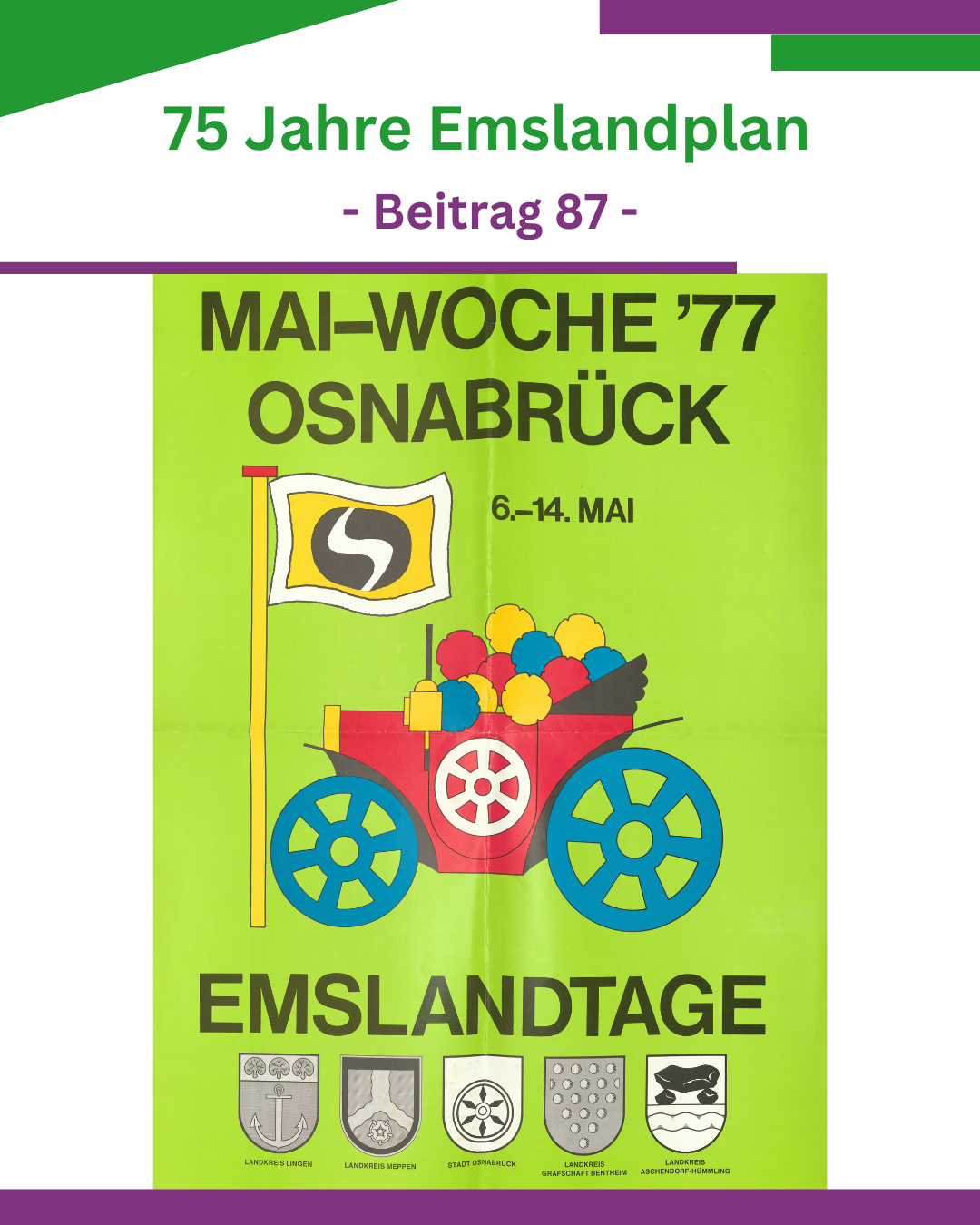 Kurz vor der Gründung des Landkreises Emsland gab es für die Emsland GmbH und die vier „Altkreise“ noch einmal die Möglichkeit, sich zu repräsentieren. Als vom 6. bis 14. Mai 1977 die Osnabrück-Tage stattfanden, war das Emsland – damals noch im Sinne eines geographischen oder wirtschaftlichen Begriffs – zu Gast. Der Emsländische Heimatbund organisierte, dass die vier Kreise Bilder zur Selbstdarstellung beisteuerten. Dafür schrieb der Direktor der Emsland GmbH und Schatzmeister des Heimatbundes, Gerd Hugenberg, die vier Kreise an. Die Motive symbolisierten das alte, traditionelle Emsland, aber auch die Fortschritte des Emslandplans. Auf dem Plakat ist auf der Fahne das Logo des Emslandes zu sehen.