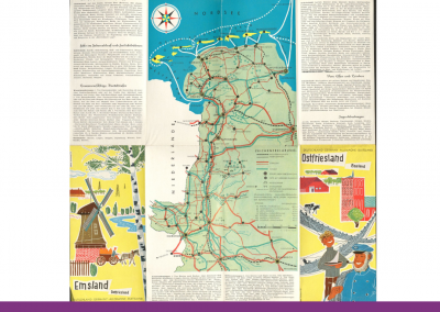 Mit der (land-)wirtschaftlichen Erschließung des Emslandes entwickelte sich das Emsland zu einer Touristenregion. Die ehemals als öde geltenden Weiten wurden nun aufgewertet, indem sie Reisenden Ruhe und Ausgleich zum Leben in den Großstädten boten. Besonders der Hümmling galt dabei prädestiniert, da er noch „urwüchsig“ und „ursprünglich“ sei. In den 1950er-Jahren wurde damit begonnen, den Tourismus langsam auszubauen. Es entstanden Werbeprospekte, oftmals in Verbindung mit dem bereits etablierten Landesverkehrsverband Ostfriesland e.V. Solche doppelten Flyer, die sowohl das Emsland als auch Ostfriesland abbildeten, wurden mehrmals aufgelegt. Sie zeigen typische Szenen, insbesondere fürs Emsland immer wieder Szenerien des Emslandplanes, wenn bspw. Ölbortürme abgebildet sind, die auch im Abschnitt „Emsland – Zukunftsland“ erwähnt werden. Kurios ist sicher die Schilderung, dass überall „neue Siedlungen mit freundlichen Friesenhäusern“ entstehen. Unterstützt wurde der Wandel zur Touristenregion auch durch die Emsland GmbH. Sie wies einigen Gemeinden Restmittel der Förderung für den Fremdenverkehr zu und sorgte 1971 dafür, dass das bekannte Merian-Heft für die Region erscheinen konnte. Damit hatte es das Emsland geschafft, deutschlandweit wahrgenommen zu werden. Dass Tourismus und die Förderung von touristischen Betrieben wichtig waren, wird auch in verschiedenen Prospekten sichtbar, auf denen sich das Emsland-Logo befand.